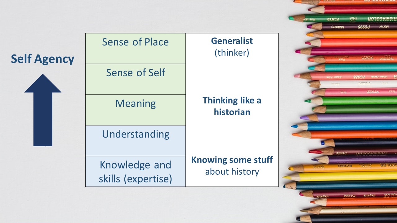 The aims can be represented in a hierarchy that move from knowing some stuff, to disciplinary thinking to being able to transfer and connect to wider subjects areas and ideas, interdisciplinary knowledge…