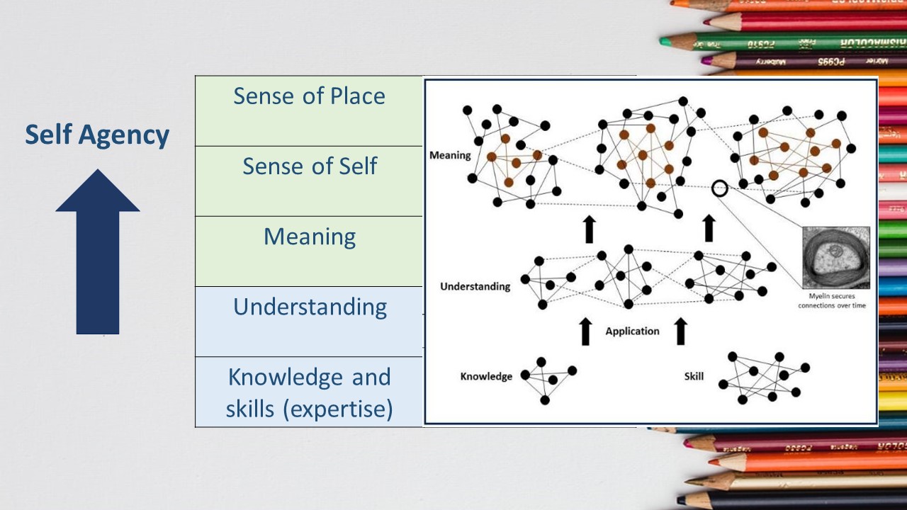 The ultimate aim of the Curriculum is to ensure all children have self-agency so that become active participants in their own lives, because each child has a strong sense of self and an understanding of their place in the world. This is the result of children seeking meaning and making connections as they build understanding from a foundation of knowledge and skills (expertise). Where knowledge and skills are the foundation and servant of the loftier goals of the curriculum.