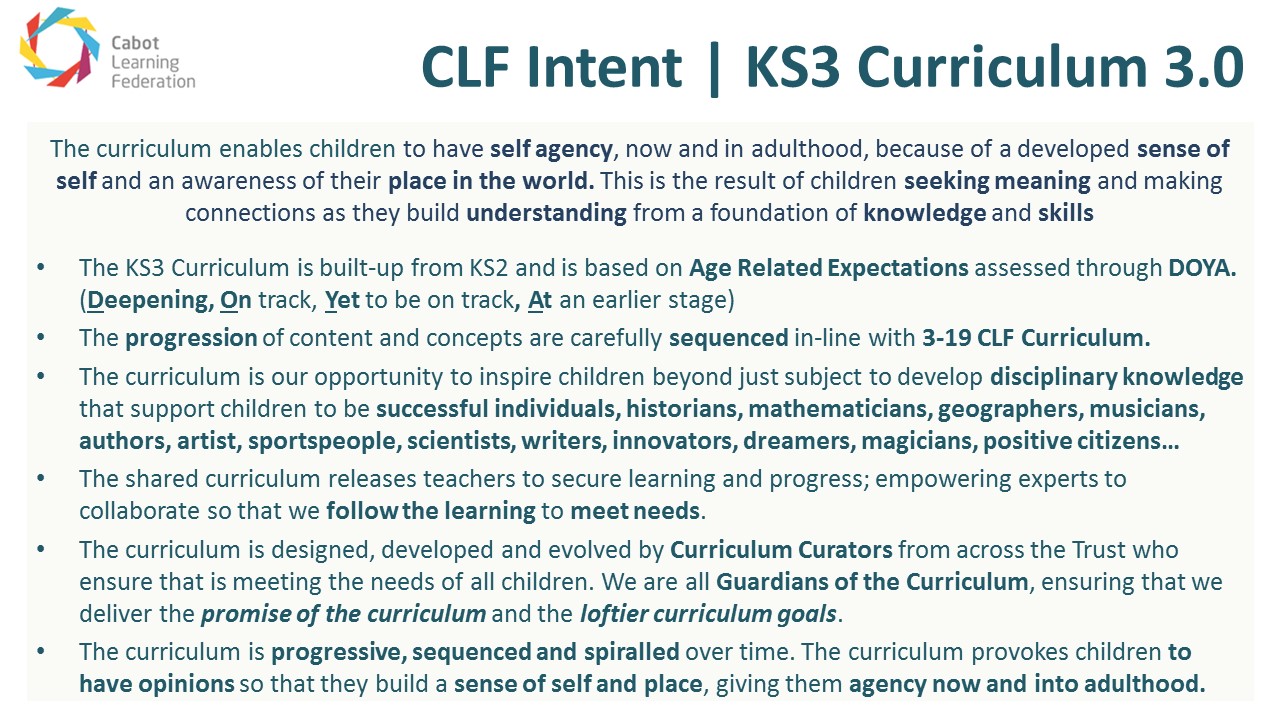 The following is an update that details the development of the Cabot Learning Federation’s Key Stage 3 Curriculum 3.0; it is the third iteration of the curriculum that has been in place for the last two years. It is the result of the work and insight of curriculum curators from across the Trust who have been charged with the deep responsibility of curating the curriculum for our children. A curriculum that allow children to dance across disciplines…