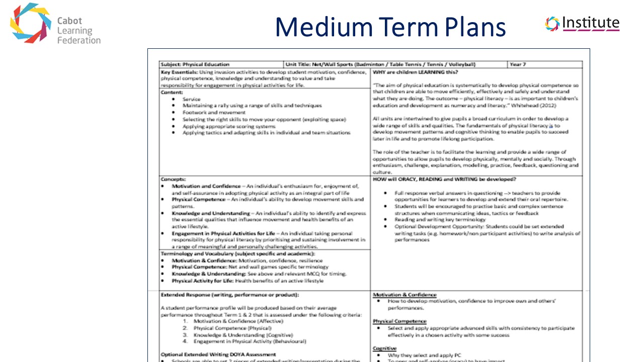 For each cycle there are medium term plans; sets direction without stifling teachers to follow the learning to meet needs; to red dance on the platform of the shared curriculum…