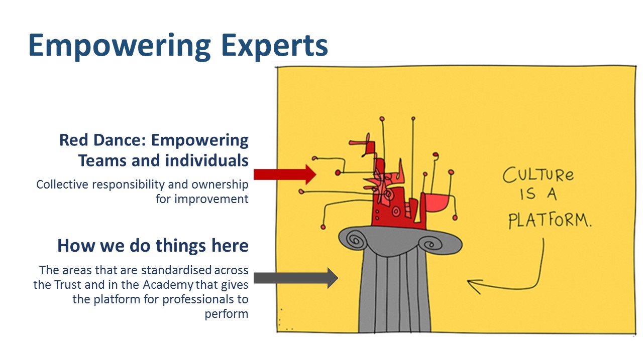 We choose to empower experts across the Trust to own and curate our Curriculum. A shared curriculum that builds a platform on which experts can perform (teach and inspire). The shared curriculum frees professionals to follow the learning to meet the needs of all children. On the platform of the curriculum we believe colleagues should be empowered to “red dance“… to realise the promise of the curriculum and its loftier goals