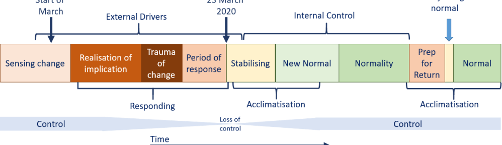 The framework identifies how we moved from sensing the change that might be caused by the pandemic to the reality of the high magnitude event; an external shunt to the system that forced educators into crisis management. The traumatic change, in mid-March, closed schools across the country with educators leading from one hour to the next. This then shifted to a period of stabilisation, in the present pandemic era. A new normal, characterised by distance learning under lock-down.